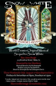 JH. I wrote, produced, and directed my original musical sequel to Snow White in 2018. The Mirror’s Revenge ran for three weeks in the San Francisco Bay Area and got rave reviews. I loved the collaboration with the composers, the musicians, and mostly the actors. When they occupied the characters, they started seeing things I had missed, even though I had worked on the script for ten years. I try to write from inside the characters’ heads, but myactors brought a whole new level of insight. They really brought the story to life. I loved that so much, I am working on another show. I learned my lesson of not trying to do everything myself, but I will definitely be putting on another show.