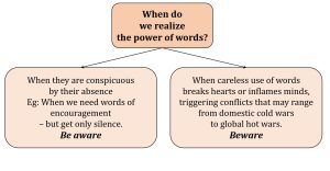 Why may we overlook the power of words? Explain with an example. Note any one occasion when the absence of words made you realize their power. Note any one occasion when you realized the danger of carelessly spoken words.