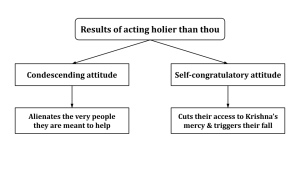 Moreover, by their self-congratulatory attitude, they can harm even themselves. How? By allowing pride to sneak into their consciousness — or sometimes, by even unwittingly inviting pride to sweep all over their consciousness. When they repeatedly pat themselves on their back for being so much better than others, their pride cuts their access to the mercy of Krishna, which is what primarily holds them up in their moral purity. Bereft of his mercy, they succumb to falls whenever their dormant impurities get triggered. They may end up falling to such an extent that their behavior may become worse than that of the people they earlier scorned.