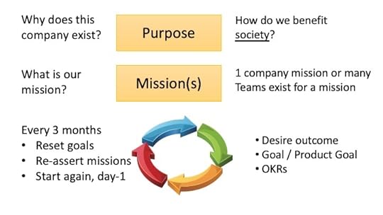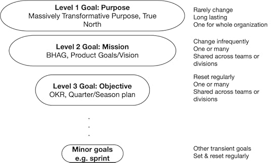 Level 2 Goals: “Mission”, maybe a product goal or “product vision”, slow to change, expect it to last years. Organizations may have multiple missions each has the potential to advance on the purpose. Teams too can have missions, actually, I think all teams should have a mission – something I’ll write more about, its best if a team has one mission at a time but it might have multiple.