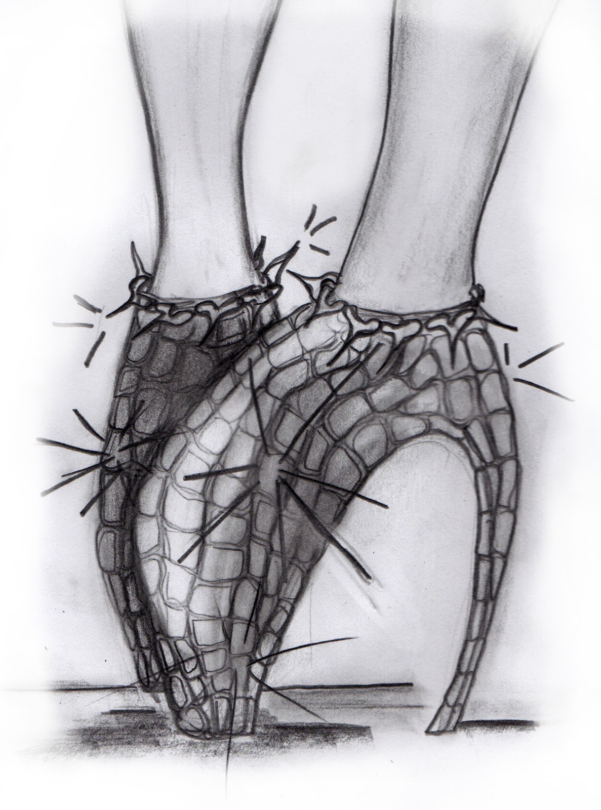 You may (or may not) know that I'm working on an illustrated middle grade novel about a twelve-year-old girl and her art teacher. In one of the scenes, my main character sees some crazy-cool shoes on TV, and here's what she draws in her sketchbook.