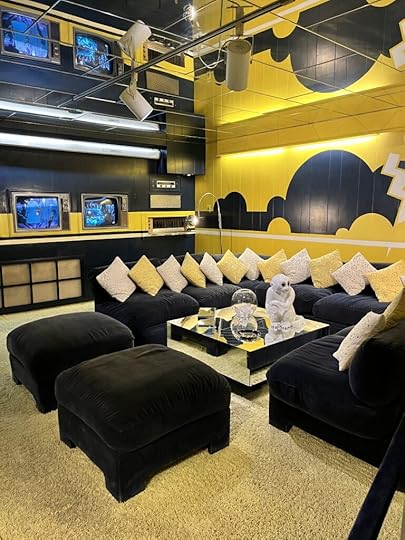The game room with yards and yards of pleated fabric on the walls.