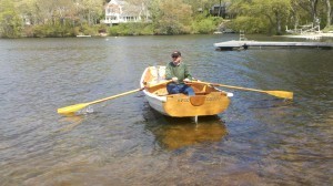 The next day I stopped off at my parents' house on Cape Cod and had the pleasure of going for a row in Spindrift, a new dinghy my father Thomas Philbrick built this winter in his basement. The plan is to use Spindrift as a tender when we're exploring the many islands of Boston Harbor, which will be featured in my next book about Boston and the Revolution.