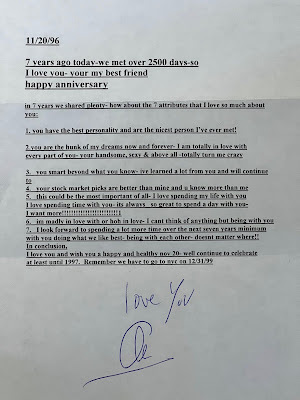 Why do they call it ‘The 7-Year Itch’? I looked it up and it’s an idiom for a yearning for change, specifically a change of sexual partner after 7-years of marriage. The expression gained popularity from a George Axelrod play from 1952 (the year Alan was born). The play was called “The Seven-Year Itch”. It was later made into a movie starring Marilyn Monroe in 1955. The funny thing is that the phrase was originally used for various skin conditions. Ha-ha. Well, on November 20, 1996, is the 7-year mark for Alan and I from whence we first met (November 20, 1989). Alan wrote me the most beautiful Anniversary letter: