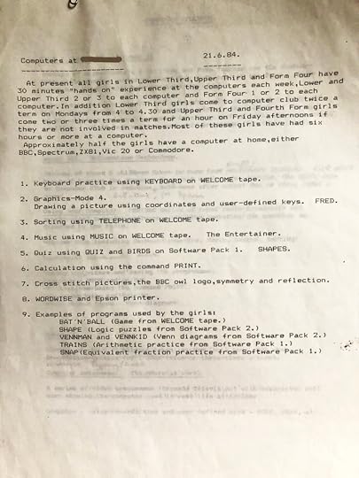 There is actually a long history of computer learning (and the use of digital tech for other types of learning) in schools, going back at least forty years. We should surely have learnt how to do this well in that time, and yet so many initiatives do not learn from the lessons of the past, reinvent the wheel, and make the mistakes that we made beforehand!My mother taught at that time in a single sex primary school, and I have no doubt (from the messages I have received from those she taught at this time) that the girls she taught gained as good a digital training as any at the time, and probably very much better than most. We need to remember therefore that initiatives to teach girls to use digital tech have also been around for a long time, and yet we still don’t seem to have learnt the lessons well aboout how to do this!Although my mother was a maths teacher, it is great to see that she was not only teaching the girls to use computers for maths, but also for music and writing, and that she was using quizzes and games in her teaching.A final striking feature is that even back then she noted that about half of the girls had a computer at home (although I wish I knew whether this meant that it was their own computer or that they had access to a family computer). It remains essential for girls to have easy access to digital tech outside the school environment if they are to be able to use it effectively for their learning.I hope others find this re-discovery as exciting as I do! The mention of BBC, Spectrum, ZXB1, Vic 20 and Commodore computers brings back so many memories of the early days of using computers in schools (and indeed in universities) at the time.