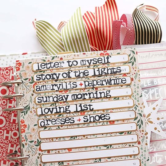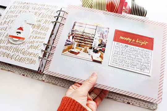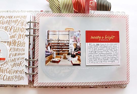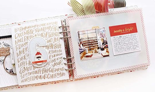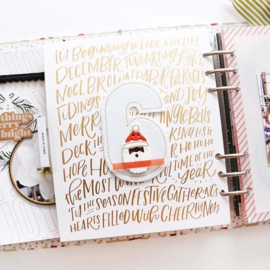 On top of the pattern paper I added a white felt number six from a previous year's kit. I love that when you look through my past albums the various numbers show up year after year in one or two spots. I also added one of the layered Santa's from this year's Main Kit. On top of the Santa I added one of the vellum phrases using red line tape.
