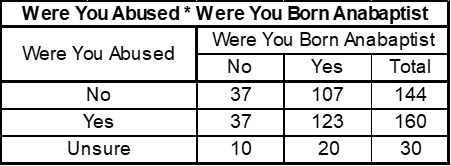 1. This seems to support the #ChurchToo movement, in which people in various churches are reporting they were abused. Anabaptist churches are not immune to child sexual abuse, and people are leaving the church having experienced child sexual abuse. This doesn’t mean they are leaving the church BECAUSE of child sexual abuse, but it does suggest that child sexual abuse is part of why they are leaving.