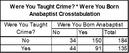 There was no significant difference in whether or not participants were taught child sexual assault was a sin based on their church of origin (Anabaptist or not). However, there was a significant difference between those who were born Anabaptist and those who were not in the likelihood they were taught child sexual abuse was a crime. Of the 319 people who answered the question, those born Anabaptist were more likely to report they had not been taught it was a crime (62%) than those who were not born Anabaptist (43%).