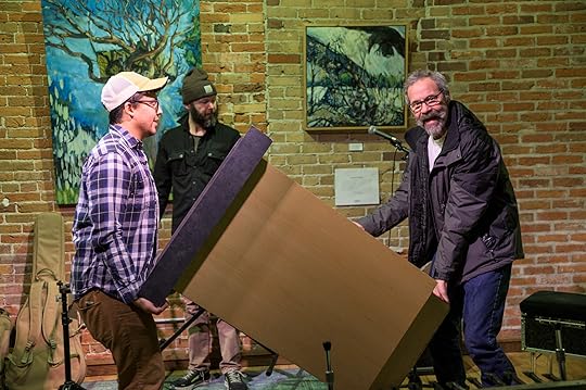 Aaron and Tony making a move. photo credit: Lee ButterworthNo getting around it, a lot of what we (mostly “I” but also “we” and that’s what I’m about to discuss here) post on social media is about me/Mike and selling books and promoting gigs and that’s because that’s the family business and we’re grateful to be in it and if you want the lumber you gotta log, or somesuch homespun hoo-hah from yrs trly, BUT: I post today’s photo in an attempt to convey how every day, every step of the way, and despite the fact that I don’t hit town in a big shiny tour bus (totally into that, just working out the budget) or a fleet of semis or a squad of advance people or a swarm of followers, over the course of a year I benefit constantly from the kindness and assistance and professionalism and dedication and preparation of countless people–some for a minute, some for years, some once, some time and time again. One of my favorite T-shirts says “Love the Band, Thank The Crew.” The photo above was taken before the event at the Local Store the other night. It shows Local Store employee Matt and my friend and merch genius Tony removing the podium I said I needed then decided I didn’t. I want this picture to stand as acknowledgement and thanks to everyone who lends, and has lent, a hand over the course of all these years and however much longer I’m allowed to do this.