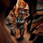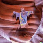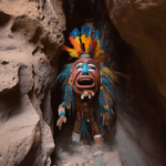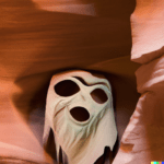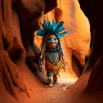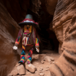 As an example I fed both DALL-E and Midjourney the following simple prompt: “A kachina is hallucinating in a slot canyon”. It contains only an actor in a setting and the activity for that actor—it lacks any style or other instructions. I wanted to see how the AIs would interpret this “on their own”, so to speak, without style or formatting instructions.