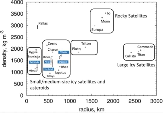 Image: This is Figure 1 from the paper. Caption: Densities and mean radii of the Uranian moons compared to those of other large moons and dwarf planets. Miranda has a low density similar to Saturn’s moon Mimas, whereas the densities of the other Uranian moons are more similar to Saturn’s moons Dione and Rhea. After Hussmann et al. (2006).