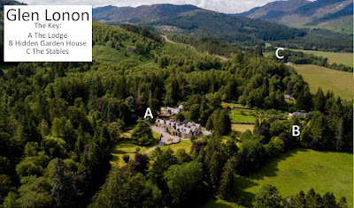 Below here is the aerial photo covering that insert, that of the estate as it exists today, The Lodge is in the foreground, and you can see the garden of Hidden Garden, and a hint of the house itself to the right of the garden. In the distance, you can just catch a glimpse of the stables, near which lies the Groom's Cottage, in the story. These days, the house that I call the Lodge is available to be rented for your family's highland holiday, should you care to experience a slice of a summer in amber yourself.