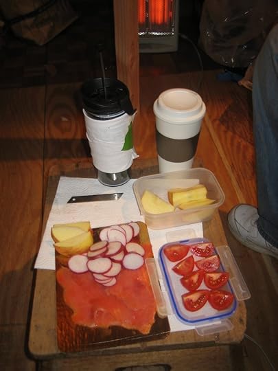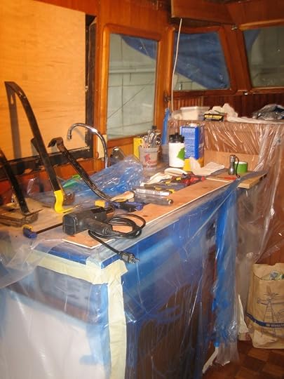 Enjoy a mouth-watering meal of fine wild-caught Alaskan smoked salmon, crisp, spicy radishes and fresh vine-ripened tomatoes, followed by a desert of sliced Rome apples and Peruvian dark chocolate, all prepared with only the finest of genuine imported Japanese utility knife blades and served on a genuine vintage mahogany boat stool. Sip Monkey-Picked Oolong tea prepared in a hotpot and served in insulated travel cups. Admire the authentic ‘boat under restoration’ ambiance, surrounded by the genuine plywood cabin sole, galley-as-workbench, plastic drop-cloths and everywhere you turn, tools, tools, tools!