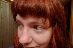 I trimmed my hair tonight, made my bangs a little thicker, a little more Zooey-esque. If you’re keeping track–and I don’t know how you could!–my hair is currently red, layered, with face framing bangs.