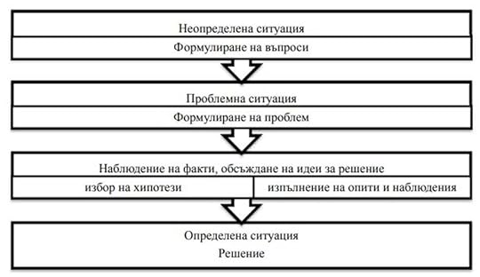 Дюи твърди, че можем да се приучим да мислим още по време на гимназалния курс (по-късно подобни твърдения срещнахме в трудовете на Де Боно). Схематично представена теорията на Дюи има следния вид:
