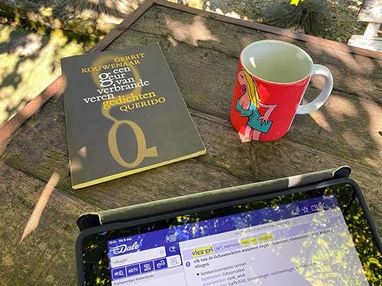 En toch bevalt het ding me, zijn ritme, klankkleuren, de vloeiende wijze waarop hij mijn gedachten stuurt. Ik kan de neiging om er een woordenboek bij te pakken niet weerstaan, zoek na, probeer te verklaren.