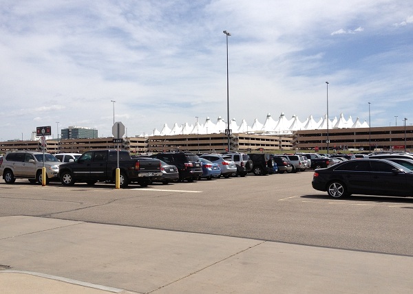 And here is a photo of the Denver Airport, or at least its parking garage, with a giant white caterpillar passing by in the background: