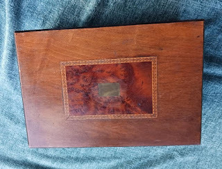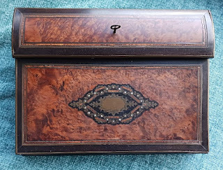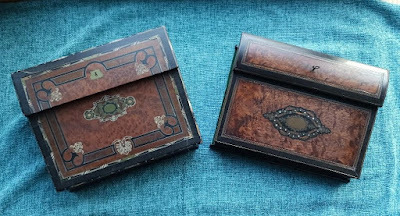 Or elaborately inlaid with decorative woods, bone, mother of pearl, and metal. They often had locks, so that one could store private correspondence in them; some even had secret compartments.