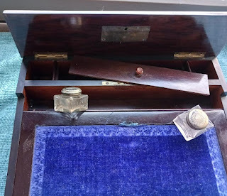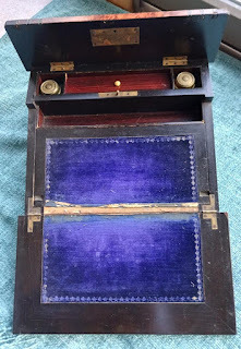 Writing slopes are elegant little boxes (generally twelve to fourteen inches wide and ten to twelve inches deep.) They’re called slopes because they open like so, providing an angled surface (generally around twenty-five or thirty degrees), usually covered with fabric (blue velvet is a favorite) that provides an absorbent surface on which to write—in short, a portable desk.