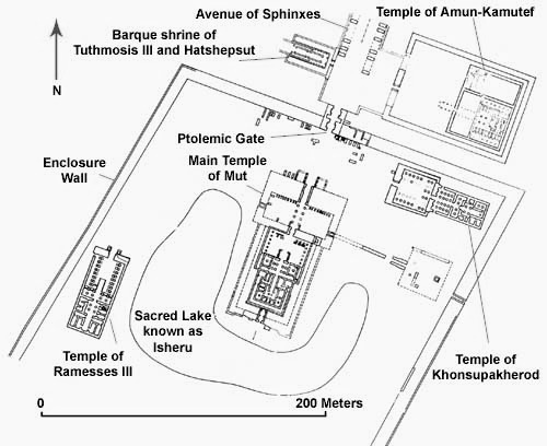 the Precinct of Amun-Ra;the Precinct of Mut;the Precinct of Montu, dedicated to the Falcon-God of War and very poorly preserved;the Temple of Amenhotep IV, a.k.a. Akhenaten, now dismantled because the guy made enemies with the wrong priests.