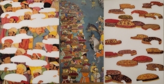 Ms Abbas has reproduced the part of the page in the Padshanahma which depicts the crowd of men bearing the bridegroom’s gifts to his bride. To the left of the two middle panels, we see the image of these bearers, but the gifts they were carrying have been removed from the image, leaving white spaces with the outlines of the shapes of the gifts, On the right side of the middle panels, we see the depictions of the removed gifts arranged against a white background. The artist has named this work “All Rights Reserved”. She devised it in 2004. By removing the gifts from the bearers, the artist has made her own interpretation of the removal of the Padshahnama from India in 1799.