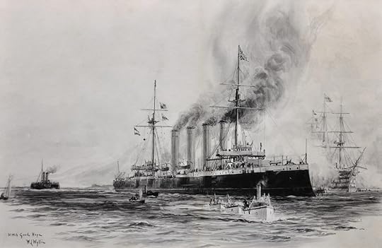 “The Scene: – A heaving unsettled sea, and away over to the western horizon an angry yellow sun is setting clearly below a forbidding bank of the blackest of wind-charged clouds. In the centre of the picture lies an immense solitary cruiser with a flag – ‘tis the cruiser recall – at her masthead blowing out broad and clear from the first rude kiss given by the fast rising breeze. Then away, from half the points of the compass, are seen the swift ships of a cruiser squadron all drawing into join their flagship: some are close, others far distant and hull down, with nothing but their fitful smoke against the fast fading lighted sky to mark their whereabouts; but like wild ducks at evening flighting home to some well-known spot, so are they, with one desire, hurrying back at the behest of their mother-ship to gather around her for the night.”