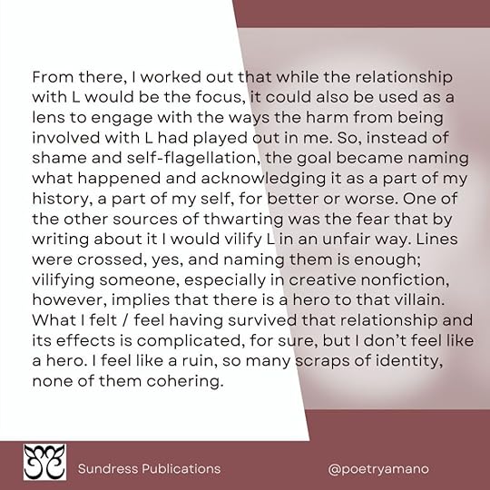 From there, I worked out that while the relationship with L would be the focus, it could also be used as a lens to engage with the ways the harm from being involved with L had played out in me. So, instead of shame and self-flagellation, the goal became naming what happened and acknowledging it as a part of my history, a part of my self, for better or worse. One of the other sources of thwarting was the fear that by writing about it I would vilify L in an unfair way. Lines were crossed, yes, and naming them is enough; vilifying someone, especially in creative nonfiction, however, implies that there is a hero to that villain. What I felt / feel having survived that relationship and its effects is complicated, for sure, but I don’t feel like a hero. I feel like a ruin, so many scraps of identity, none of them cohering.