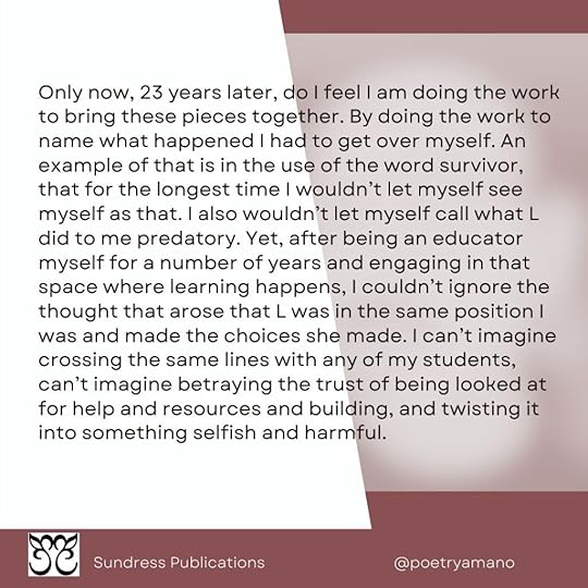 Only now, 23 years later, do I feel I am doing the work to bring these pieces together. By doing the work to name what happened I had to get over myself. An example of that is in the use of the word survivor, that for the longest time I wouldn’t let myself see myself as that. I also wouldn’t let myself call what L did to me predatory. Yet, after being an educator myself for a number of years and engaging in that space where learning happens, I couldn’t ignore the thought that arose that L was in the same position I was and made the choices she made. I can’t imagine crossing the same lines with any of my students, can’t imagine betraying the trust of being looked at for help and resources and building, and twisting it into something selfish and harmful.