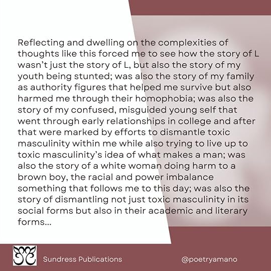 Reflecting and dwelling on the complexities of thoughts like this forced me to see how the story of L wasn’t just the story of L, but also the story of my youth being stunted; was also the story of my family as authority figures that helped me survive but also harmed me through their homophobia; was also the story of my confused, misguided young self that went through early relationships in college and after that were marked by efforts to dismantle toxic masculinity within me while also trying to live up to toxic masculinity’s idea of what makes a man; was also the story of a white woman doing harm to a brown boy, the racial and power imbalance something that follows me to this day; was also the story of dismantling not just toxic masculinity in its social forms but also in their academic and literary forms…