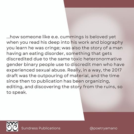 …how someone like e.e. cummings is beloved yet when you read his deep into his work and biography you learn he was cringe; was also the story of a man having an eating disorder, something that gets discredited due to the same toxic heteronormative gender binary people use to discredit men who have experienced sexual abuse. Really, in a way, the 2017 draft was the outpouring of material, and the time since then to publication has been organizing, editing, and discovering the story from the ruins, so to speak.