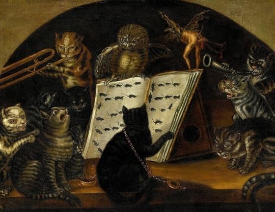 Cats being instructed in the art of mouse catching by an owl — Lombard school (oil on canvas, within a painted lunette, c.1700