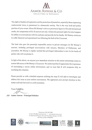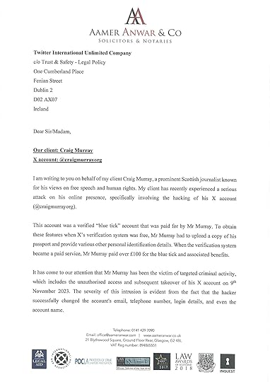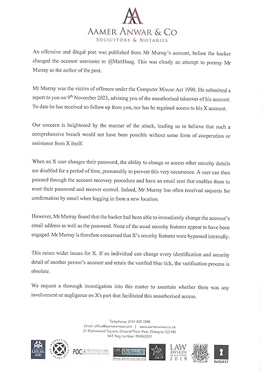 It is also consistent with Twitter complicity that despite my reporting the hack to X support within five minutes of the password being changed, and reminding them repeatedly ever since, there has been no response other than automated ones from X Support. Furthermore another victim of this crime, the real @matthuang, has also reported to Twitter the appearance of the fake @matthuag account from the renaming of @craigmurrayorg, impersonating him. Matt Huang also, a person of some note, has been unable to obtain any response from Twitter.