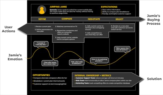 It labels her buying process, user actions, emotions, and corresponding solutions.