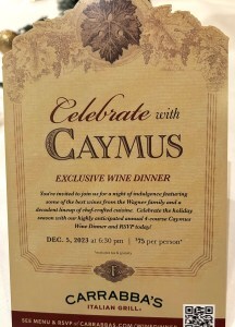Around town, we enjoyed the Caymus wine dinner at Carrabba’s with friends. This was a pre-fixed four-course meal. Each dish was accompanied by a different wine. I must gain several pounds each time I attend one of these events.