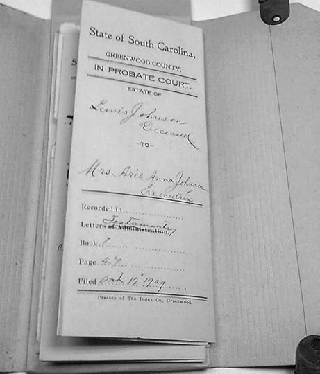 When I got out the packet, I saw Mrs. Arie Anna Johnson, and the year filed was 1909. This was the right Lewis Johnson. It meant a lot to me. It was the first time someone had left a will. Do you ever think, "We don't have wills in our family." Well, you should check. I was surprised to see the top of the page. Lewis had made this out in Spartanburg County, South Carolina. That reveals another place for me to look.