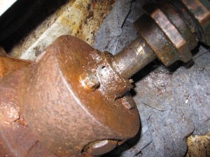 We ended up hiring someone to help and he was unable to loosen the shaft. Fortunately he was able to get the shaft collar loose from the transmission. He then cut the shaft just in front of the collar and we had to have a new shaft made and purchase a new shaft collar. Here’s a picture of the shaft collar and shaft before it was cut.
