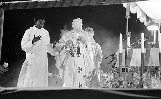 Gerald Annan-Forson, Pope John Paul II, assisted by Reverend Bobby Benson, leads an open-air mass at the Accra Sports Stadium, 1980