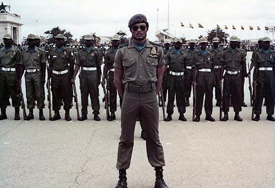 Gerald Annan-Forson, Jerry John Rawlings stands at attention in front of the troops after handing over power, 1979 Annan-Forson returned to Accra from California in the mid-1970s and began to develop his visual approach by documenting the changing city and its eclectic, diverse inhabitants. He worked across genres and styles as a freelancer, photographing heads of state and national events and selling pictures to New African, African Business, West Africa, Essence, and international magazines and newspapers. Even as radical ideas of Pan-African political unity were diluted, Accra was alive with highlife and Afrobeat music and celebrations of global Black styles. A rising generation sought new dreams and hustles that were at once locally grounded and cosmopolitan. Two of his early major assignments were to capture the visit of Charles, the Prince of Wales, with the head of state General I. K. Acheampong, in 1977—an unusual pairing of old imperial ruler with young defiant military officer—and, in 1980, to photograph the arrival in Ghana of the pope, not long after another coup. Annan-Forson’s camera witnessed the mix of political ideologies, social pleasures, and economic struggles of 1970s and 1980s Accra, a city characterized by its easy intimacies and stark contrasts. His images highlight juxtapositions that express the contradictions of life in the coastal capital after the celebrations of independence faded.