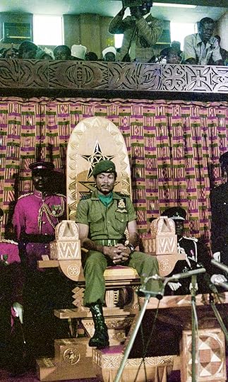 Gerald Annan-Forson, Jerry John Rawlings sits on a golden stool crafted by artist Kofi Antubam and prepares to hand over power to the democratically elected Dr. Hilla Limann in Parliament House, 1979Annan-Forson was thrown into political change when a coup d’état on June 4, 1979, elevated Flight Lieutenant Jerry John Rawlings as chairman of the new ruling Armed Forces Revolutionary Council. Annan-Forson had been schoolmates with Rawlings and suddenly found himself with insider access to a revolution. Rawlings, like Annan-Forson, was of mixed European and Ghanaian ancestry, and at times the photographer was mistaken for the head of state. Annan-Forson documented key national transformations from an intimate perspective, telling the spectacular story of change through the candid eyes of major players as well as common people caught in unexpected moments of terror, joy, contemplation, and frustration. He was an observer at the center of power. As a photographer among soldiers he documented the tenuous ways power was formulated.