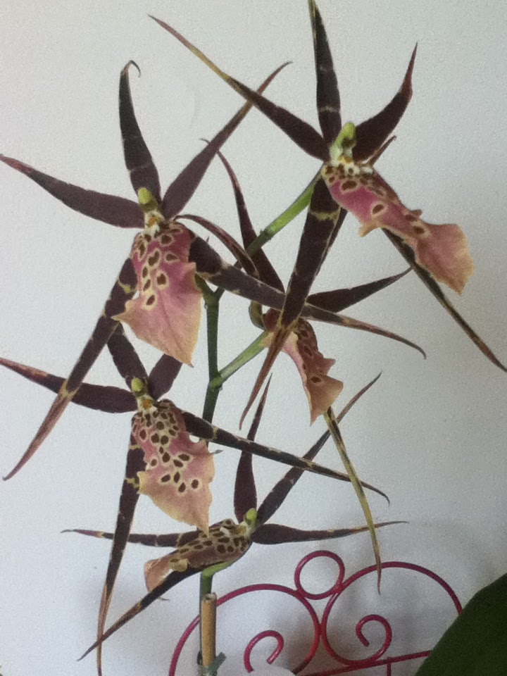 Then a friend brought me a really weird orchid. She said she looked for something mysterious for me and to start with I thought it was creepy. Now I find it fascinating. For one thing it seems to turn to look at me. The flowers are never facing the same direction twice in a row. I'm thinking of using it in a future mystery novel. I can almost hear it whispering, "How about if the victim is strangled with the tendril of a tropical vine? Or poisoned with the juice of a rare poisonous plant?