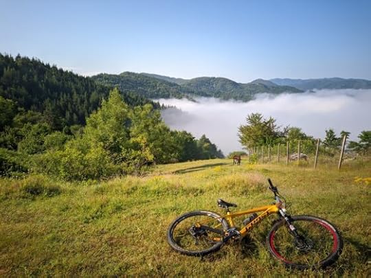 И така вече карам трети ден, като се движа добре, теренът беше от особено значение за скоростта ми и предпочитах да въртя нагоре. Сутринта на третия ден беше интересна – влажна и мъглива, даже някой ме почерпи по пътя. Спирах за снимки и си мислех кога ще свърши изкачването. Стигнахме до асфалт, от който трябваше да излезем със спускане, съответно скоростта ми беше по-висока и влизам на поляна с висока трева, но още съм по инерция и си мисля, че е опасно и тогава се случи ПАДАНЕТО, падане имаше и предните дни, но това… ме съсипа. Направих голяма човка. Предната гума в дупка като леген и аз полетях. Приземих се на гърди и го усетих мощно. Лежах някакво време в шок и болка, после се обади коремът ми, който беше разстроен и трябваше да се скрия в храстите за пореден път него ден и докато съм там виждам как се задава друг колоездач и не успявам да реагирам да го предупредя, а колелото ми лежи където паднах. Не знам дали го е видял, но и той прави човка в същата или в друга дупка! Той поне не пострада като мен. След това се появи и друг и маркирахме дупките, за да няма други жертви. Те продължиха, аз останах да поседя, защото ми се виеше свят, чувствах се зле и лявото рамо ме болеше. Не знаех дали и колко съм в състояние да карам, но нямах друг избор. До селската почивка имаше път, а до мястото на лагера още много. Качих се след като ми беше малко-по добре и се молех да оцелея. Болката беше силна, но в определено положение беше по-добре. Всяко спиране или подрусване ме удряха в рамото и беше ужасно. Стигнах до едно опасно място като циментирани стени, които се събират надолу и храсти с тях. Беше си цяло предизвикателство някак да мина от там. Това беше селото и стигнах до общата почивка, където Пламен вече отмаряше.