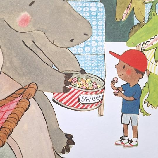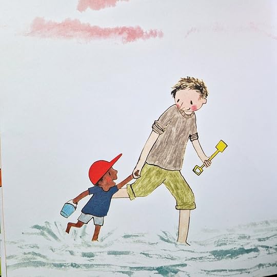 The train rumbles on – CLANK RUMBLE, CLANK-CLANK RUMBLE – down to the sea. At the next stop, ‘a crowd of crocodiles with spades and rings and buckets’ joins the carriage. But Dad is too busy on his phone to notice.