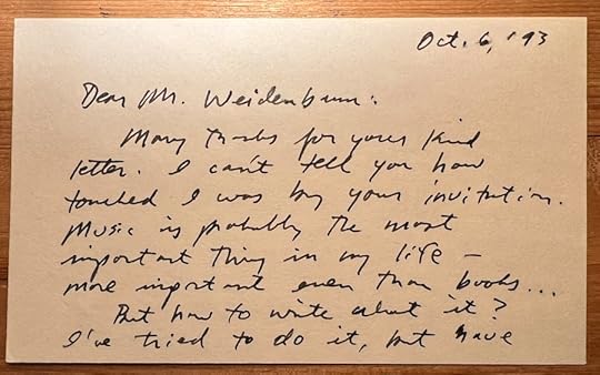 Many thanks for your kind letter. I can’t tell you how touched I was by your invitation. Music is probably the most important thing in my life — more important even than books …