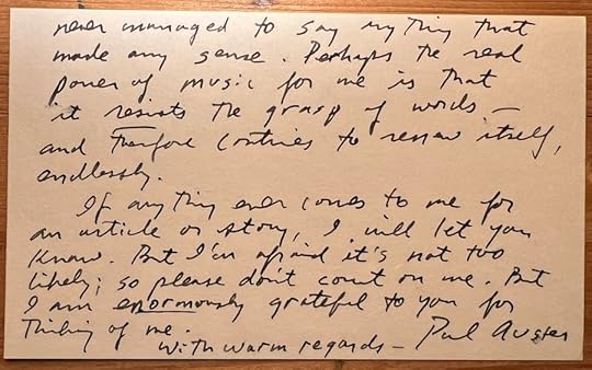 When I was an editor at the magazines, primarily Pulse!, published by Tower Records, I occasionally sought out writers other than professional critics to write for us, in particular musicians and novelists. The list of novelists who did wasn’t a long one, but it was a respectable one, including as it did Jonathan Lethem, Richard Kadrey, Geoff Nicholson, and the late David Bowman, among others. One who declined was Paul Auster, and in some ways I’m glad he did. Had he said yes to my invitation, I’d only have had an article. But because Auster said no, back in October 1993, I have this letter, postmarked from Brooklyn: