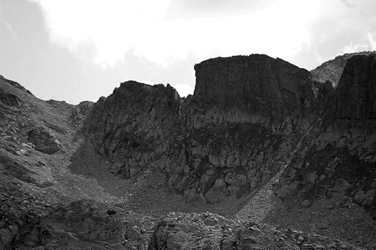 Изглед на скалата от юг. Виждат се Рибните езераПродължихме по трудния път през Павлев връх (2667 м), Черна поляна (2716 м) и Пъстри слап (2683 м) към далечната хижа Македония по зимната маркировка с метални колове. Докато минавахме през върховете Голяма Пъстрица (2606 м), Ангелов връх (2643 м) и Голям мечи връх (2617 м) времето внезапно се развали. Гръмотевичната буря беше толкова силна, че металните колове непрекъснато жужаха от напрежението. Страх ни беше да продължим по билото и заобиколихме върха на около 200 м по-ниско, но много по-трудно без пътека и по наклонен терен докато стигнем х. Македония.