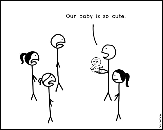 I think my baby is impossibly adorable, of course, but every parent thinks that about their baby, so that offers no information. Everyone who has met her or seen a picture of her has commented on how cute she is, but they’d say that no matter what she looked like—which I know as someone who has commented on the cuteness of babies ranging from perfect to hideous—so there’s no information there either. FYI, I once depicted what happens when friends visit someone with an uncute baby: