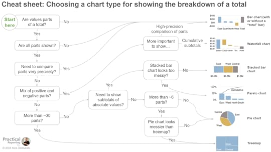 The best advice I can offer is (as always) to make sure you’ve figured out why you’re creating a chart in the first place (what specific insight you need to communicate, what specific question you need to answer, etc.) before you start designing it. Then, try visualizing the data in various chart types and ask yourself which one best communicates the specific insight/answer/etc. that you needed the chart to communicate. Note that a lot of this trial-and-error process can be avoided by using the decision tree below, which is included in my Practical Charts On Demand course: