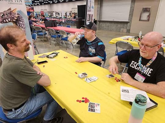 My thoughts: I didn’t really remember what this game’s description was by the time Gen Con came around, but it turned out to be far more cerebral—and far less thematic—than I anticipated. It also felt very much like two separate games: determining the secret letters was the bulk of the game play, with guessing the words coming in almost as an afterthought. Trying to figure out the letters was a serious exercise in logic, and in the end, my game partner, another demo agent, and I had to resort to guessing a couple of them. (Guessing the words was a simple matter of association and most likely answer.)