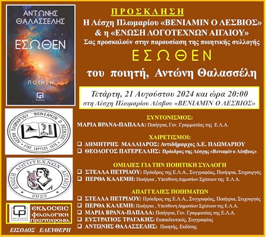 Παρουσίαση του βιβλίου του Αντώνη Θαλασσέλη "Έσωθεν" στο Πλωμάρι Λέσβου