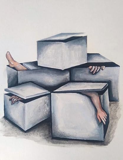 Katharine A. Viola: This was such an intriguing story with great details, so it wasn't too hard to find something I wanted to paint. The macabre imagery of bodies in boxes really stood out to me.